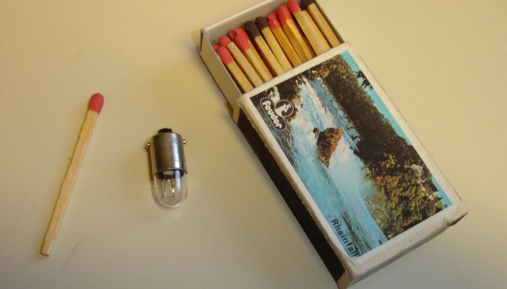 Bild oben: Sinngemäss hat das Bundesgericht entschieden, es sei nicht Sache der Gerichte festzustellen, ob mit einem Glühlämpchen von 0.8Watt ein 25’000Watt-Scheinwerfer betrieben werden könne oder nicht. Das Bild vom Rheinfall auf der Zündholzschachtel symbolisiert wohl eher den Reinfall der Bundesrichter