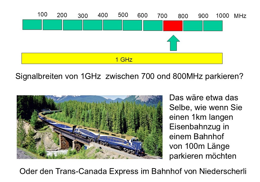 Bild 4: Frage zu Bild 4 oben, wie wollen Sie eine 1000MHz (1GHz) Signalbreite im Frequenzband 700-800MHz parkieren? Denn auch 700-800MHz ist ein für Mobilfunk reserviertes Frequenzband.