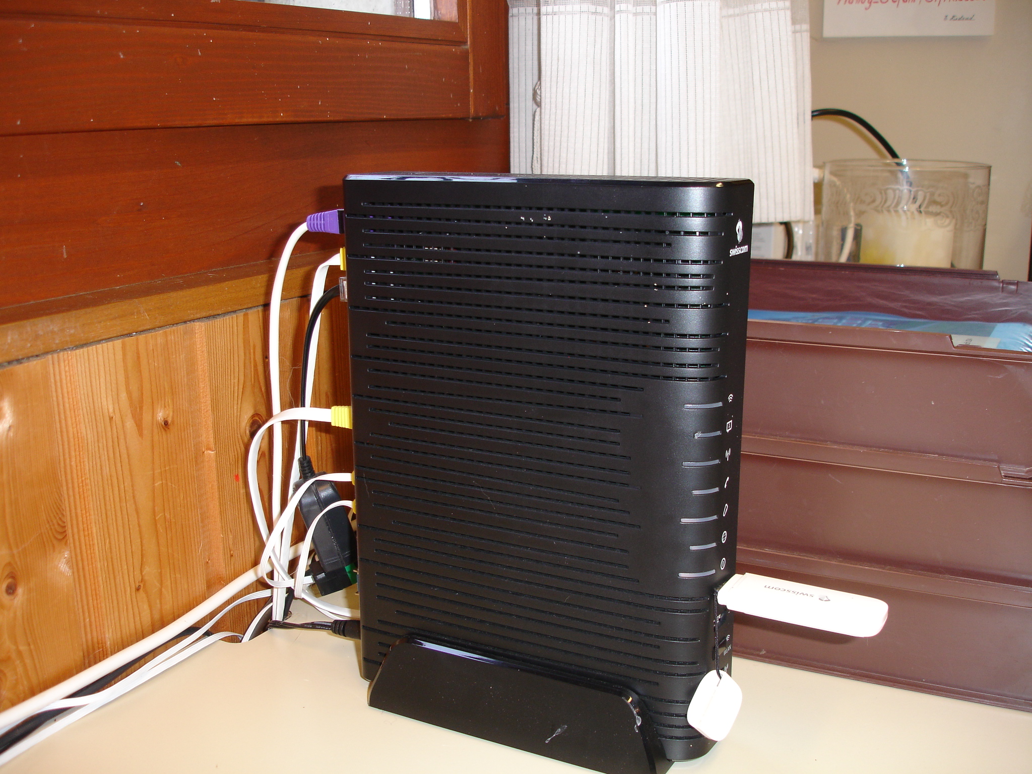 Bild oben: Null-Funk-Router von Swisscom für 3 Telefone, 1 Fax, 2 PC, 1 TV-Apparat. Alles problemlos verkabelt. Funktioniert tadellos ohne WLAN!