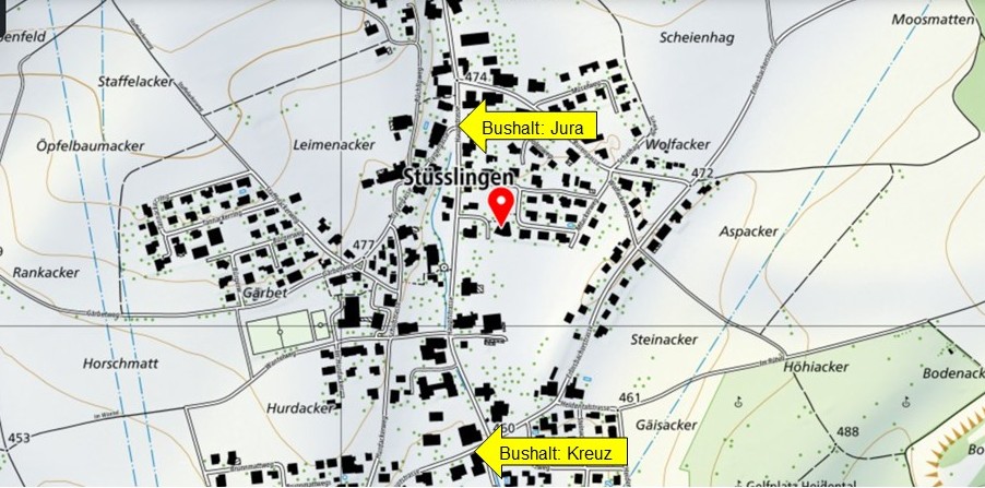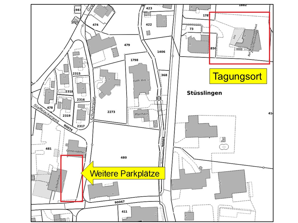 Direkt am Tagungsort, beim Kirchgemeindehaus, hat es nur eine beschränkte Anzahl Parkplätze. Die Gemeinde Stüsslingen stellt uns freundlicherweise weitere Parkplätze auf dem unteren Schulhausplatz beim Gemeindehaus zur Verfügung.