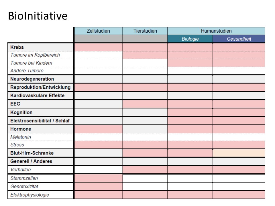Bild 6: Alle Ampeln auf rot stellt die Bio-Initiative, das Gegenstück der ICNIRP aus der freien Wissenschaft. Die Bio-Initiative ( www.bioinitiative.org )ist eine internationale Arbeitsgruppe aus zur Zeit 29 Wissenschaftlerinnen und Wissenschaftlern, die nicht im Solde der Industrie stehen.