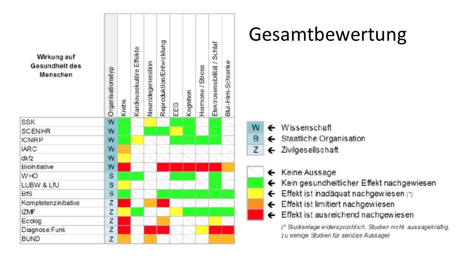 Bild 1: Es zieht sich ein deutlicher rot/grüner Faden durch die Ergebnisse. Dort wo grün dominiert (kein Effekt gefunden) steckt das Millionensponsoring der Industrie und staatliches Wirtschaftsinteresse dahinter und dort wo rot dominiert (Effekt ausreichend nachgewiesen) stehen zivile Organisationen, die sich den Schutz von Mensch und Tier, von Flora und Fauna auf die Fahne geschrieben haben und dafür jeden Franken mühsam zusammenbetteln müssen. Idealisten die oft ihre ganze Freizeit und ihr Privatvermögen opfern und dafür noch nach Noten gemobbt werden. Nicht selten wird ihnen auch noch gleich ein Rufmordkommando auf den Hals gehetzt. Siehe: http://www.izgmf.de/scripts/forum/index.php?mode=index