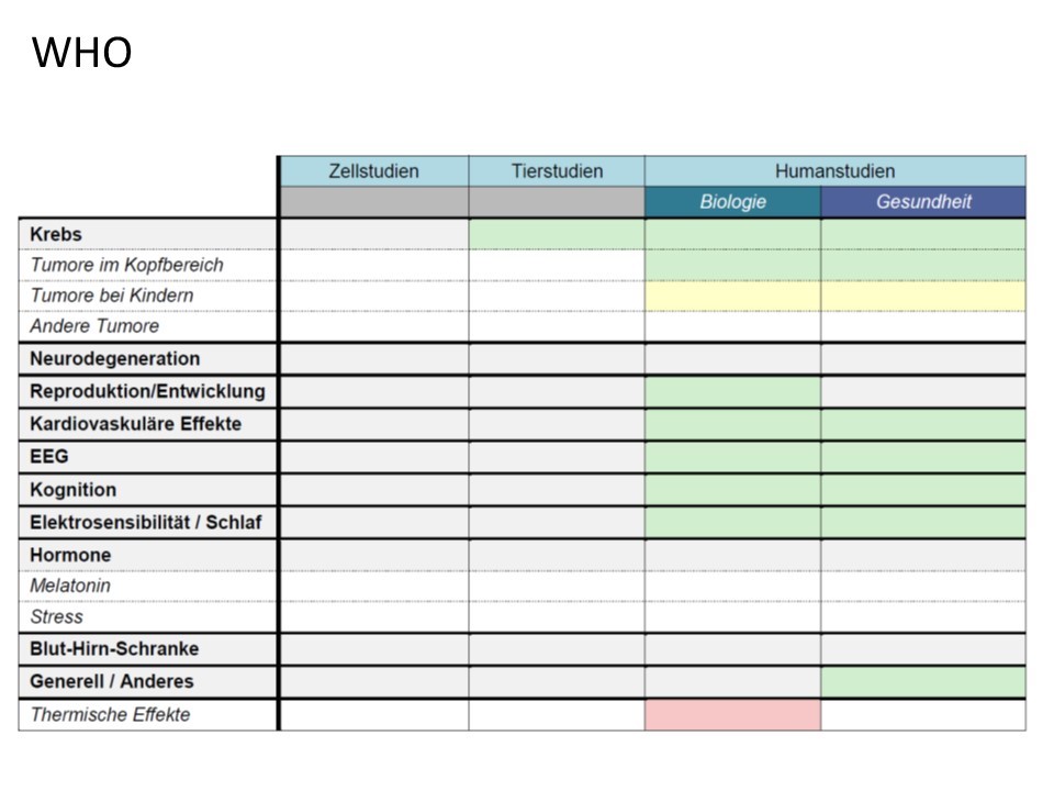 Bild 4: Die viel zitierte WHO äussert sich weder zu Zellstudien noch zu Tierstudien. Den Rest schreibt sie wortgetreu der ICNIRP ab. Das heisst, den bei ihr tätigen Lobbyisten der Industrie.